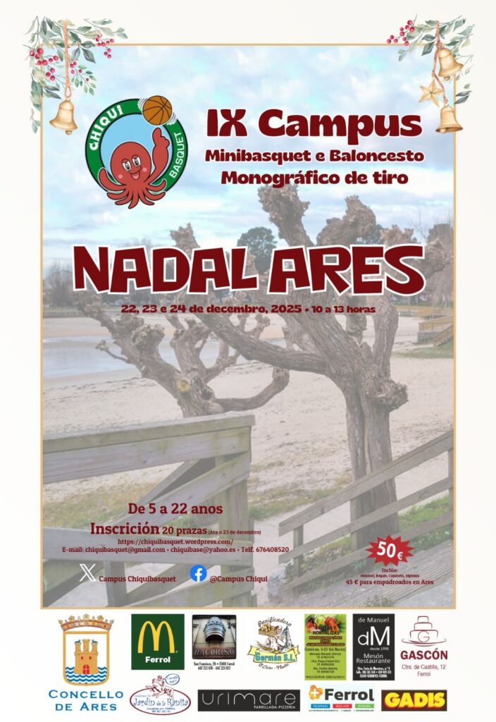 A iniciativa dirixida por Chiqui Barros xa ten as súas inscricións abertas, habilitando 20 prazas para as persoas interesadas. O Campus realizarase do 22 ao 24 de decembro en horario de mañá, de 10:00 a 13:00 h,. e vén a complementar a oferta de mellora baloncestística que o propio Barros dirixe cada verán en Ares. […]