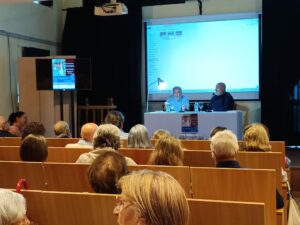 O salón de actos da Alianza Aresana acolleu o venres pasado o relatorio do veciño Juan Prados, eencargado de afondar na historia da lamprea e da súa singularidade, trazando na súa charla un percorrido para unir gastronomía, tradición e mesmo unha revisión da función da lamprea en sociedades pretéritas como a Grecia clásica e Roma. E acompañándoo no faladoiro estivo tamén o alcalde de Ares, Julio Ignacio Iglesias Redondo.
