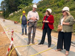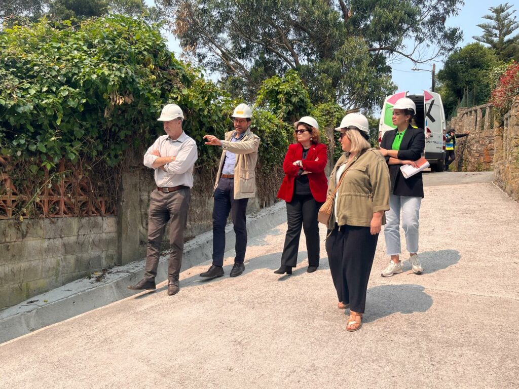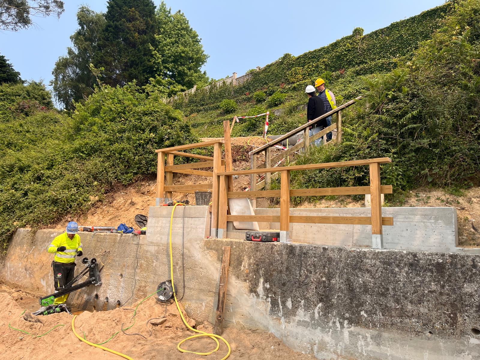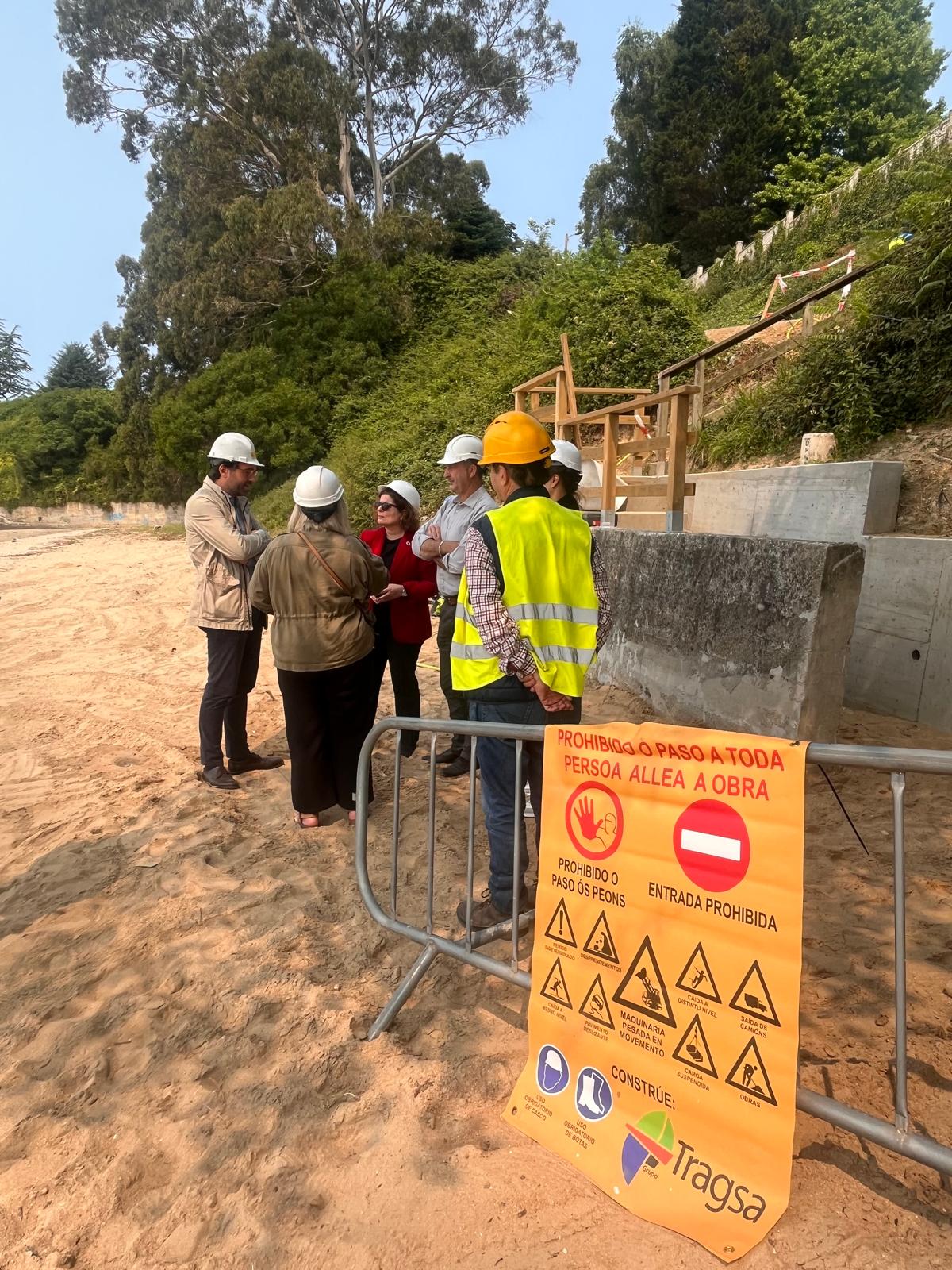 As autoridades supervisaron o estado actual das obras, onde se está a materializar unha nova escaleira de formigón e un reacondicionamento da senda peonil que leva ata ela, delimitándose toda a zona a partir de varandas de madeira –aínda pendentes de instalarse na súa totalidade—e poñendo fin ós problemas de escorrentía.