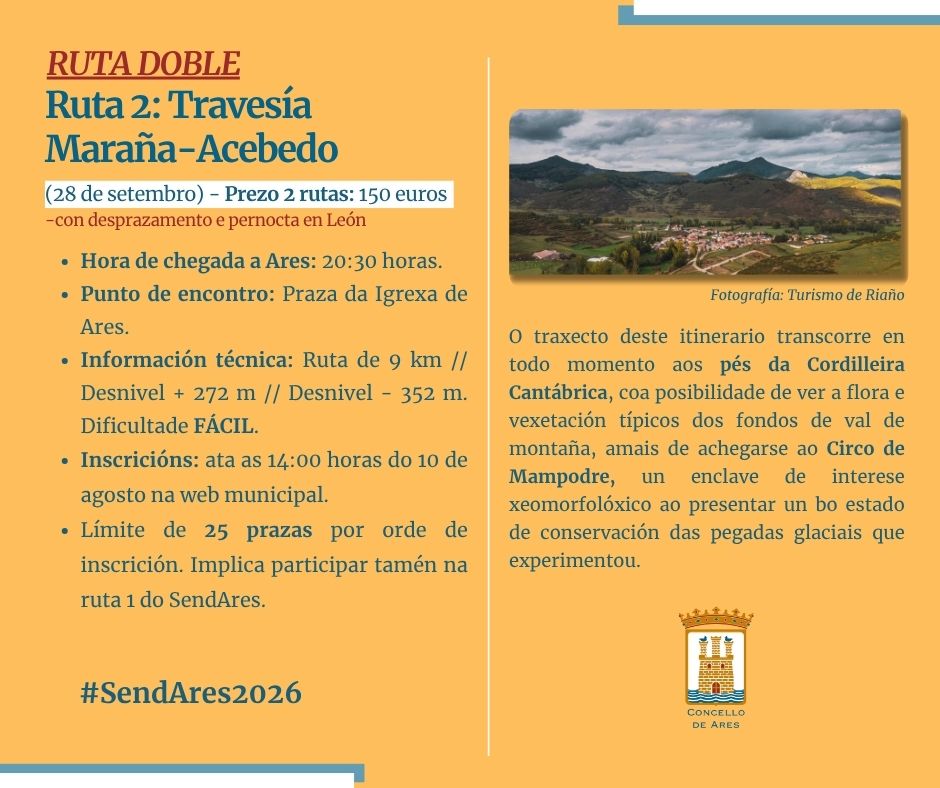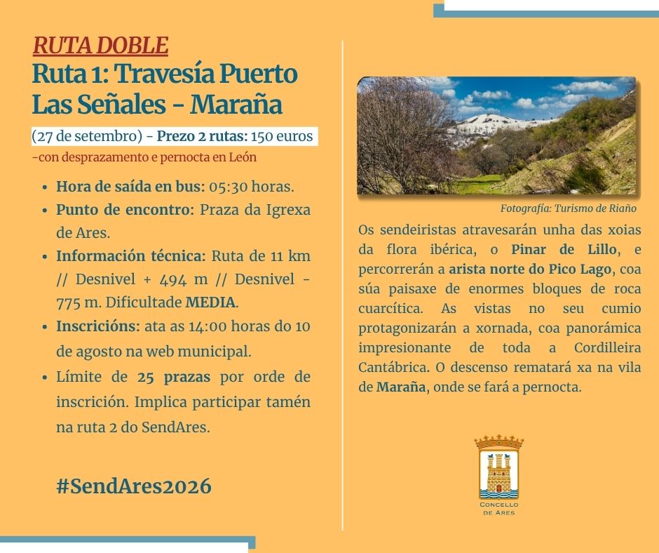 O Concello de Ares vén de informar da ampliación do prazo para reservar prazas e participar na saída cara León do SendAres 25-26 ata as 14:00 horas do 🗓️ xoves, 14 de agosto.