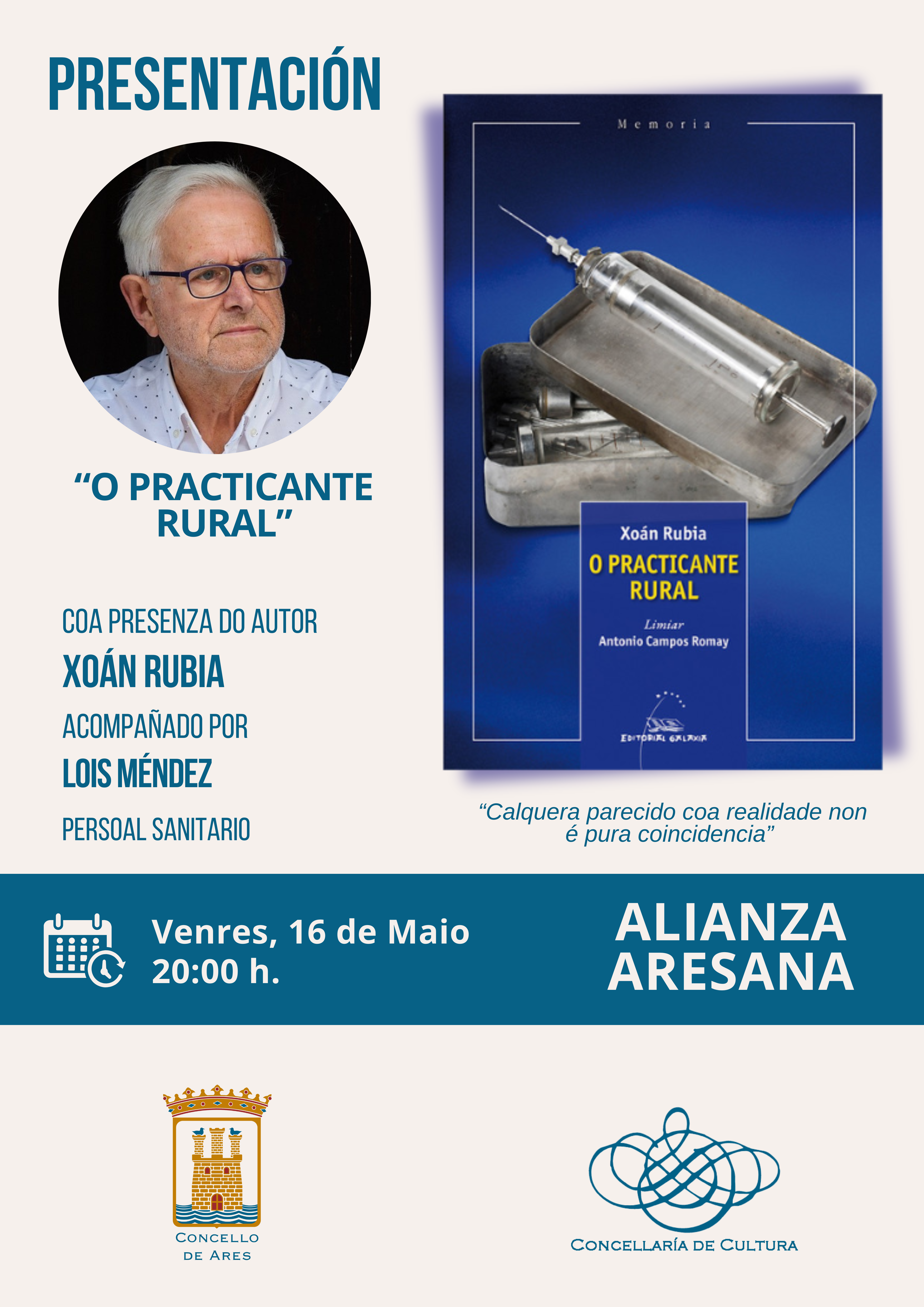 Tamén haberá oco para falar dunha das novidades literarias en lingua galega dentro da comarcal como é ‘O practicante rural’, as anotacións memorísticas que achega o mugardés Xoán Rubia sobre a súa experiencia exercendo como profesional da saúde na Galicia rural do século pasado. Rubia presentará a súa obra o 16 de maio ás 20:00 horas no salón de actos da Alianza Aresana e afondará nas anécdotas que lle deixaron toda unha vida de traballo no sistema público galego, ao mesmo compás que poñía música a toda unha xeración.