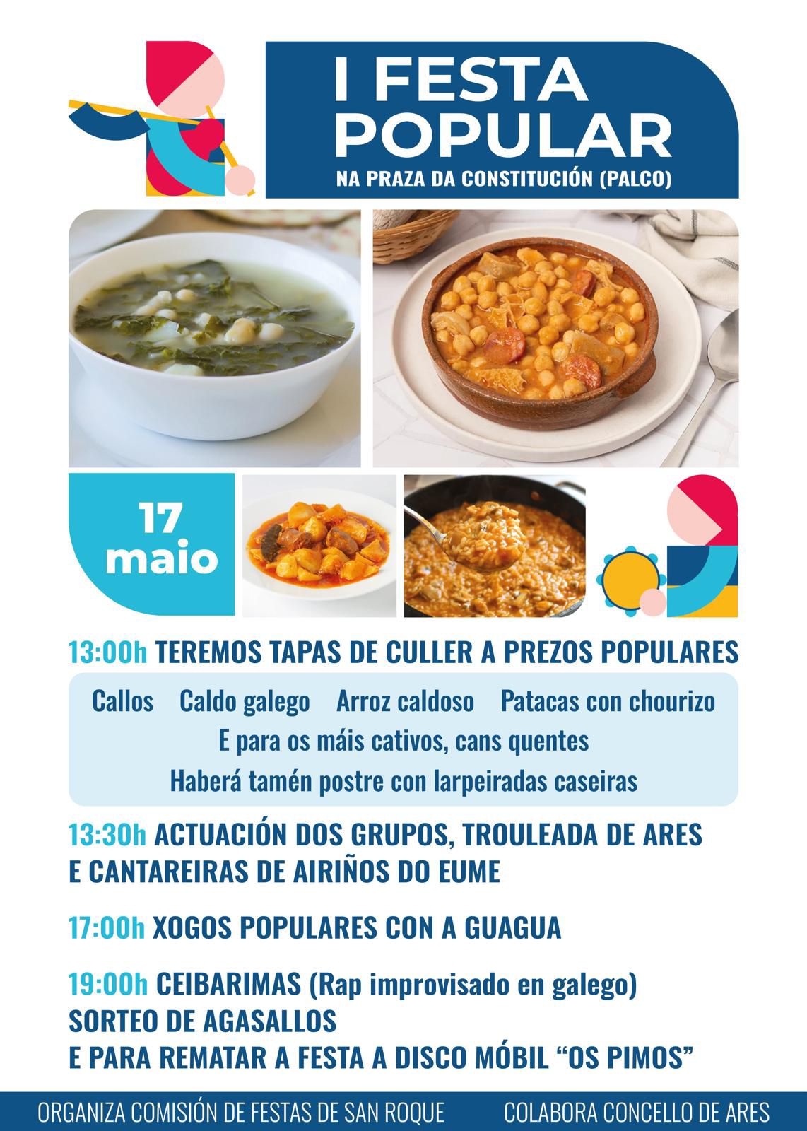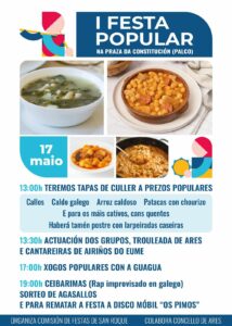 A parte máis gastronómica das Letras Galegas 2025 en Ares chegará o 17 de maio na Praza da Constitución coa I Festa Popular que propón a Comisión de Festas de San Roque, en colaboración co Concello, no que haberá tapas de culler, dende caldo galego a arroz caldoso ou callos, rap improvisado en galego, disco móbil e actuacións musicais de grupos como Trouleada de Ares ou as Cantareiras de Airiños do Eume.