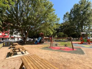 Máis aló dos elementos relativos ós pequenos, a área de lecer viu medrar o mobiliario urbano para os adultos que acompañan aos menores, colocando bancos e mesas rústicas con asentos adosados que melloran o confort dunha zona moi empregada na cotiandade da veciñanza.