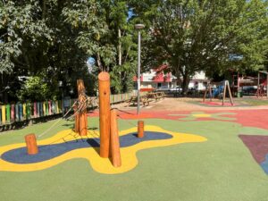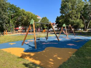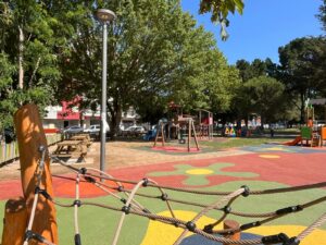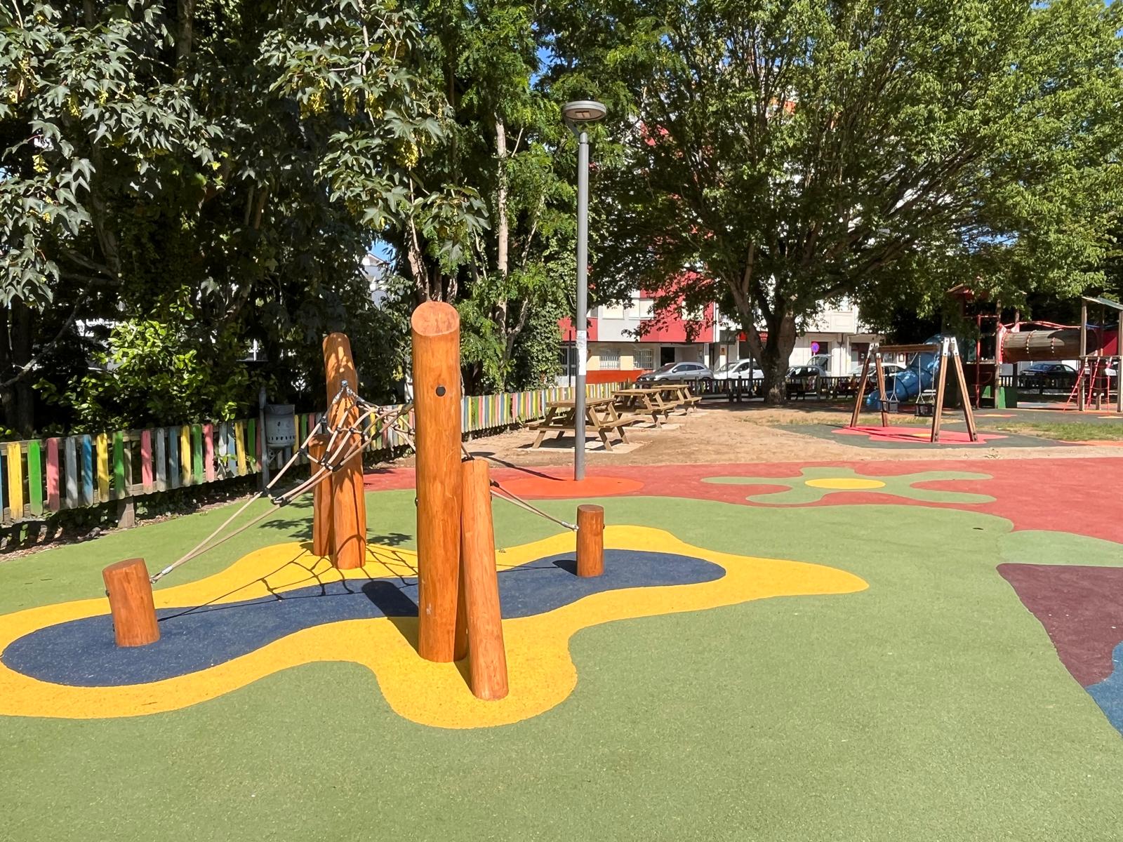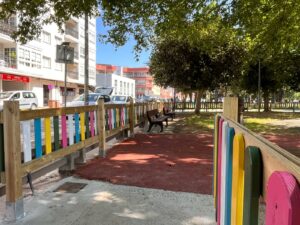 Arredor destes xogos, como xa se fixo tamén na actuación previa materializada en 2024, instaláronse os seus respectivos pavimentos de caucho de seguridade, priorizando a minimización dos posibles impactos das crianzas. Tamén se incorporaron varias vallas de madeira de pino na parte colindante coa Avenida Saavedra Meneses, de cara a incrementar a protección dos nenos e nenas con respecto á circulación de vehículos.