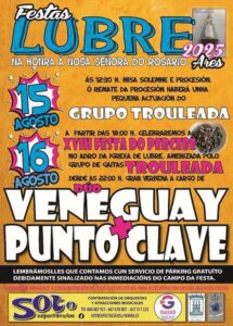 Festas de LUBRE 2025 – AresNa honra á Nosa Señora do Rosario 📅 15 de agosto🕛 Ás 12:30 h. Misa solemne e procesión.🎶 Ó remate