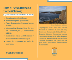 Seixo Branco-Lorbé será o percorrido que realizarán os participantes durante a xornada do 23 de novembro, acompañados por unha paisaxe moi mariñeira. A reserva de