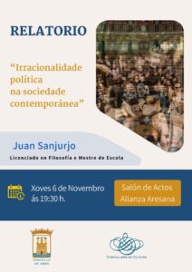 O licenciado en Filosofía e tamén mestre de escola Juan Sanjurjo estará o vindeiro 6 de novembro, a partir das 19:30 h., no salón de
