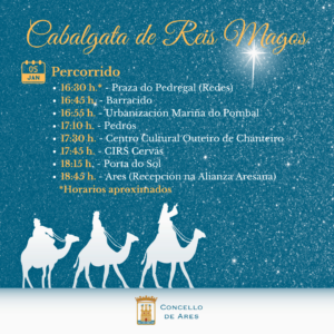 As súas Maxestades percorrerán a partir das 16:30 horas tanto as parroquias como o núcleo urbano, onde rematarán o itinerario para facer a súa recepción