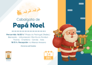 A súa cabalgata visitará as parroquias do municipio, iniciando o percorrido ás 16:00 horas na Praza do Pedregal, en Redes, e pechará o itinerario cunha