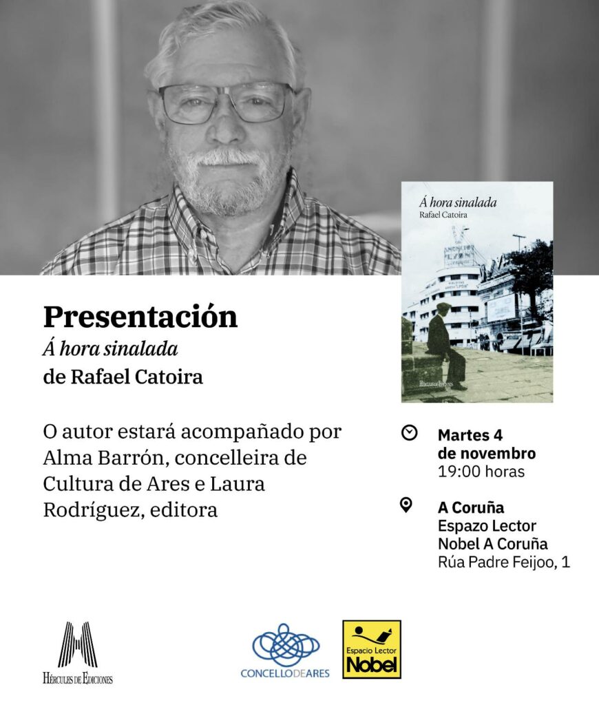Rafael Catoira, ganador de la última edición del Premio Alén de Novela Corta del Ayuntamiento de Ares, conversará mañana, 4 de noviembre, con Alma Barrón, concejala de Cultura, y Laura Rodríguez, editora de Hércules de Ediciones, sobre su novela galardonada “A hora sinalada”. El acto de presentación se celebrará en el Espazo Lector Nobel de […]