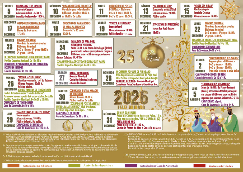 La Comisión de Fiestas de San Roque también se sumará a la programación con su Navidad en el Mercado Municipal de Ares, dos jornadas —del 27 al 28 de diciembre— con talleres, gastronomía, magia y el sorteo de su macrocesta. Y quienes lo deseen podrán celebrar la Nochevieja en la fiesta que propone la Comisión de Fiestas del Mar en la Plaza de la Iglesia.