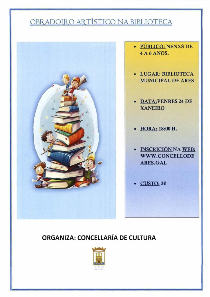 A Biblioteca Municipal de Ares promove un obradoiro para incentivar as habilidades artísticas dos nenos e nenas de 4 a 6 anos Poderás inscribirte dende hoxe, 22 de xaneiro, a partir das 16:00 horas vía telemática na web www.concellodeares.gal. INFORMACIÓN DO OBRADOIRO Este venres, 24 de xaneiro A partir das 18:00 horas Biblioteca Municipal […]