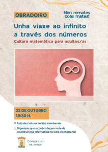 La primera cita de No termines con las mates será el miércoles 22 de octubre a las 18:30 horas, con el taller titulado “Un viaje al infinito a través de los números”, en el que se explorarán los distintos tipos de números y su evolución, además de aprender conjuntamente qué es el infinito, si existe una única infinitud como tal e incluso construir una superficie infinita durante la sesión.