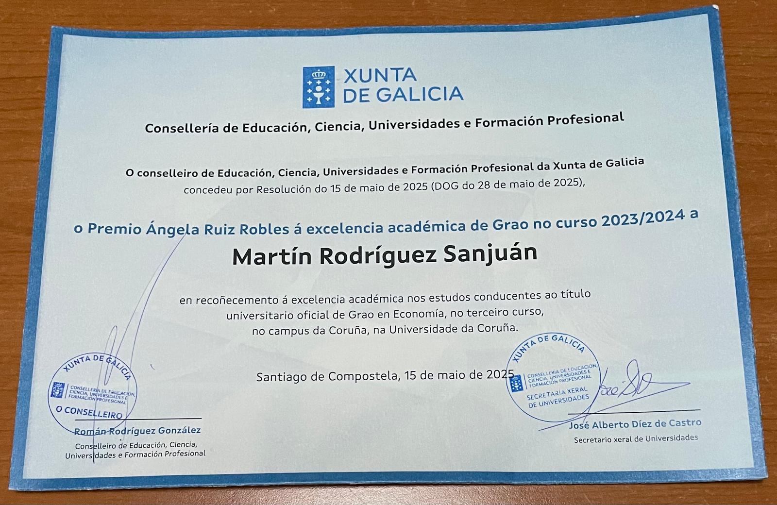 La buena noticia le llegó la semana pasada en Santiago de Compostela: el vecino de Ares Martín Rodríguez Sanjuán fue reconocido con el Premio Ángela Ruiz Robles a la excelencia académica en el curso 2023-2024 por su expediente en el Grado en Economía de la Universidad de A Coruña.