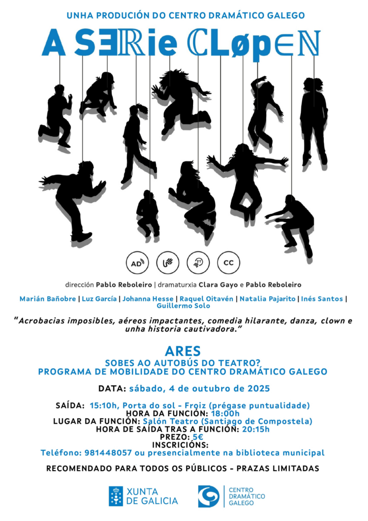 • La Concejalía de Cultura se suma al programa de movilidad del Centro Dramático Galego (CDG) para que la vecindad pueda acudir a Santiago de Compostela, saliendo el 4 de octubre a las 15:10 h. desde Porta do Sol – Froiz.