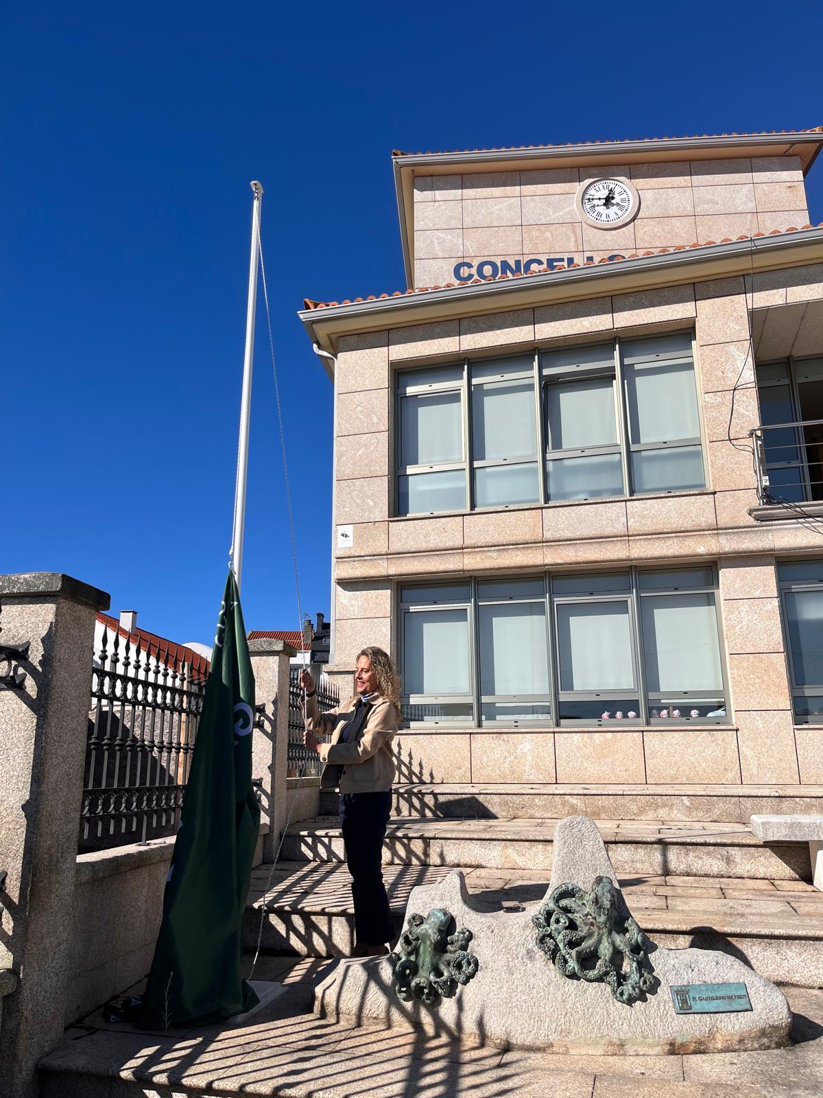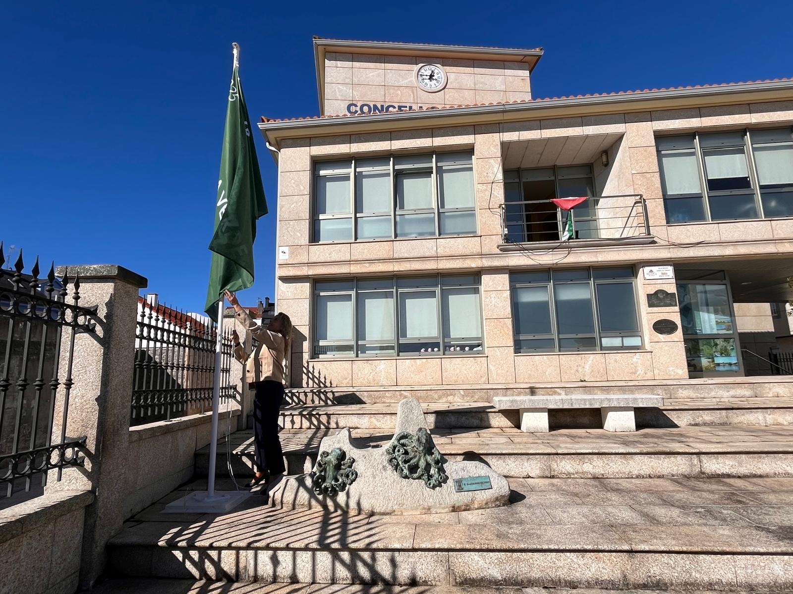 La concejala de Medioambiente, Lucía Blanco, izó ayer mismo el galardón medioambiental otorgado por la Xunta de Galicia al municipio por segundo año consecutivo: la Bandera Verde 2025, situada en la entrada de la casa consistorial de Ares.