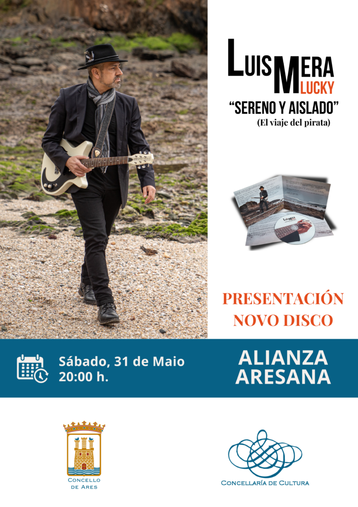 O músico e compositor afincado en Ares Luis Mera, Lucky, achegarase o vindeiro sábado, 31 de maio, ás 20:00 horas ata o salón de actos da Alianza Aresana para compartir coa veciñanza un momento especial: a presentación do seu último álbum titulado Sereno y aislado (El viaje del pirata)”, no evento promovido pola Concellaría de Cultura.