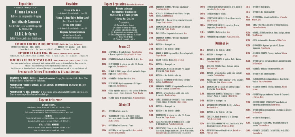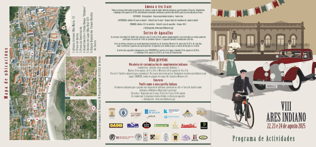 Entre as principias opcións, manteranse os tres tipos de roteiros –en barco pola ría, en autobús histórico polas parroquias ou a pé guiados polo artista Cayetano Lledó–, haberá espazo para os relatorios divulgativos e exposicións tematizadas –como é o caso das mostras de mulleres e o asociacionismo galego na emigración ou o achegamento a Delfín Vázquez, retratista de indianos–, elaboracións de pratos en directo, actuacións musicais, a recreación de escena indiana a modo de photocall da Sociedade Cultural O Tilo… e un sinfín de posibilidades para fortalecer o fondo vínculo do Ares Indiano coa memoria colectiva e a historia local.