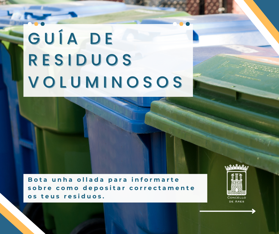 Que se pode depositar cada terceiro mércores de mes nos puntos de recollida de residuos voluminosos? Como facelo correctamente para axudar á súa xestión e reciclaxe? Para responder a estas dúbidas e contribuír ao correcto depósito de voluminosos en Ares, o Concello difunde unha breve guía que axuda a entender as diferentes tipoloxías que se poden colocar ao carón dos colectores.