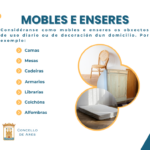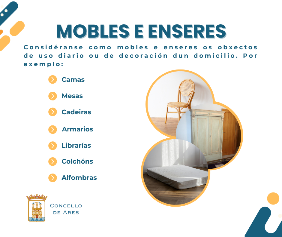• Mobles e enseres: mesas, cadeiras, armarios, colchóns, alfombras…