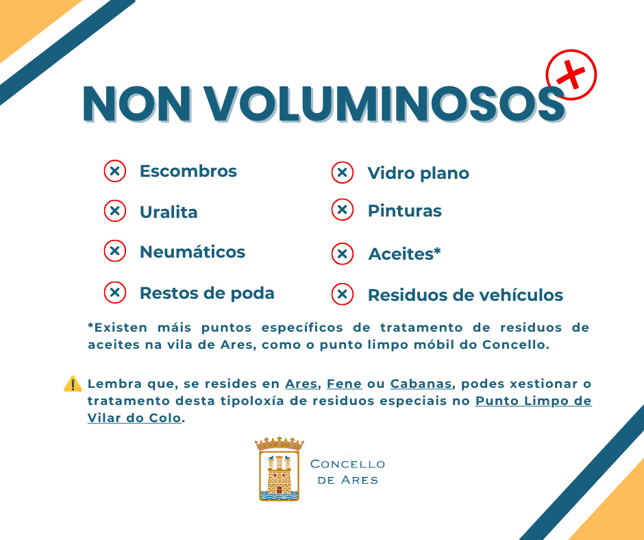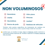 Materiais como os escombros, a uralita, os neumáticos, as pinturas, os restos de poda, aceites e residuos de vehículos, entre outros, NON son voluminosos, e polo tanto non se poden depositar nos colectores.
