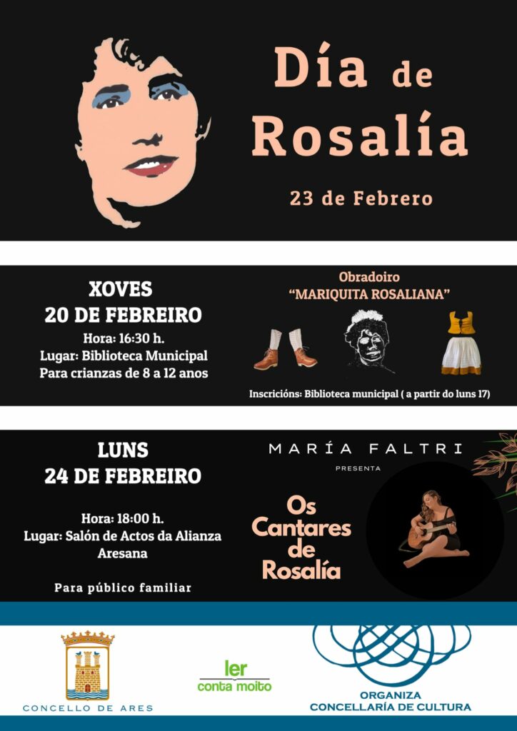 A primeira delas será este xoves, 20 de febreiro, ás 16:30 horas nas instalacións da biblioteca municipal. Trátase do obradoiro ‘Mariquita Rosaliana’, unha sesión onde se confeccionará a figura de Rosalía recortando e logo pegando diferentes prendas típicas da vestimenta da época. O obradoiro destínase a crianzas de 8 a 12 anos e precisará de reserva previa a partir de hoxe, luns, 17 de febreiro, na Biblioteca Municipal de Ares.