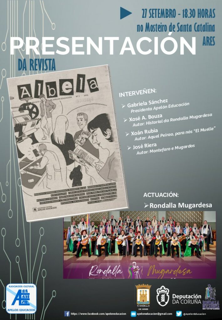 O sábado 27 de setembro ás 18:30 horas o Mosteiro de Santa Catalina en Ares será o escenario da presentación da revista cultural Albela unha publicación promovida pola Asociación Cultural Apelón Educación coa finalidade de difundir e poñer en valor a historia a cultura e a memoria colectiva da comarca