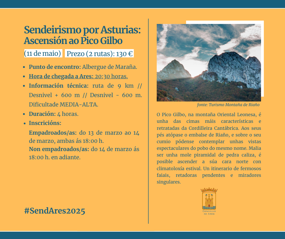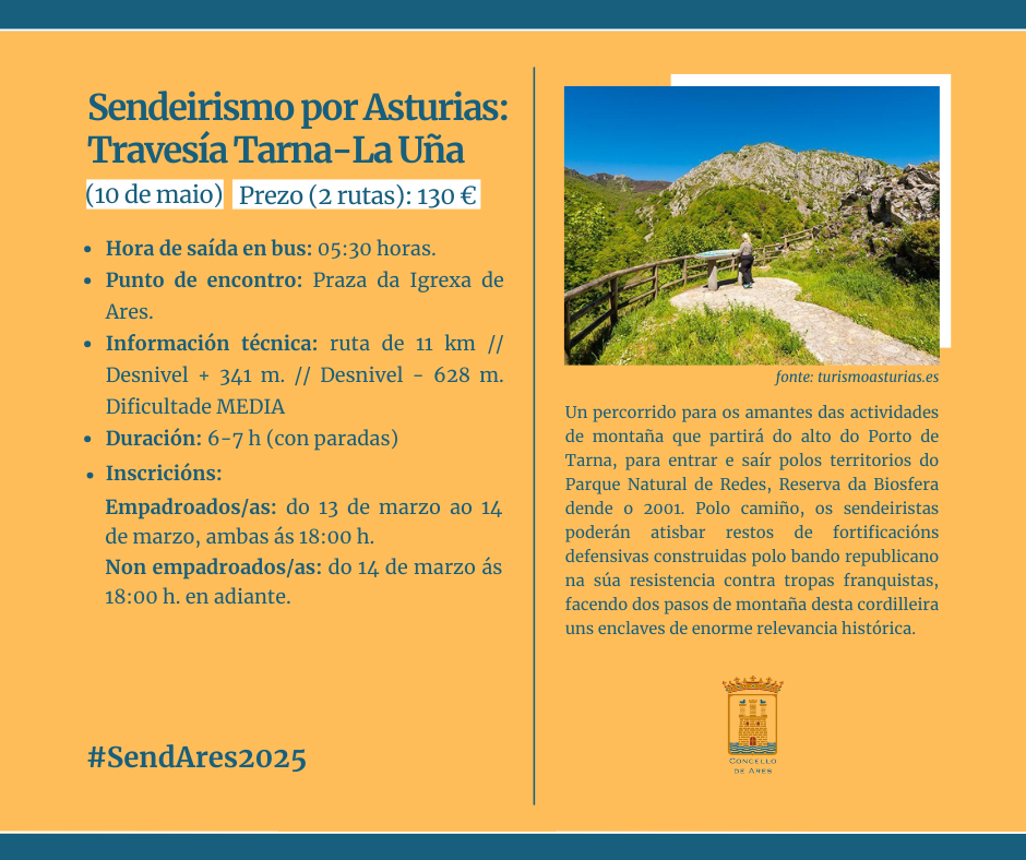 A Concellaría de Deportes vén de anunciar un roteiro extraordinario para o mes de maio que levará aos participantes do SendAres, o programa municipal de sendeirismo, ata Asturias. Será durante a fin de semana do sábado, 10, e domingo, 11 de maio.