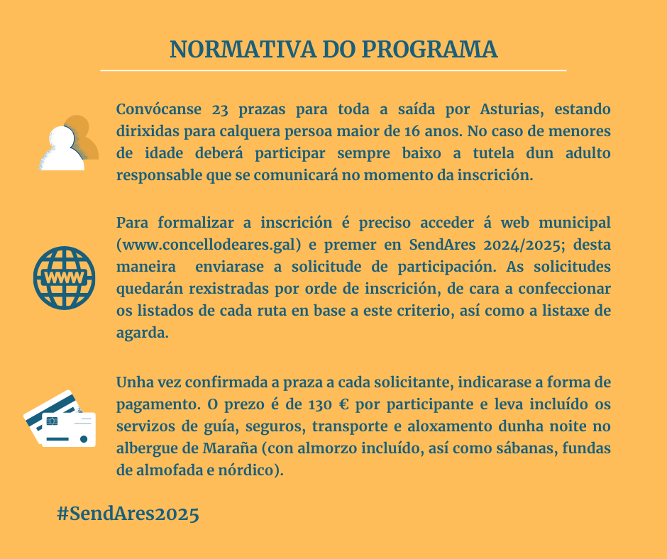 O prezo para toda a experiencia lúdico deportiva de fin de semana é de 130 euros, incluíndo os servizos de guía, transporte e seguros, amais do aloxamento dunha noite no albergue de Maraña (con almorzo e enseres para a pernocta como nórdico, sábanas e funda de almofada). O autobús partirá o sábado, 10 de maio, ás 05:30 h. da Praza da Igrexa de Ares e chegará á localidade o día seguinte preto das 20:30 h.