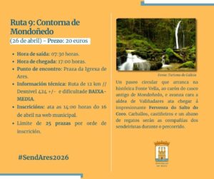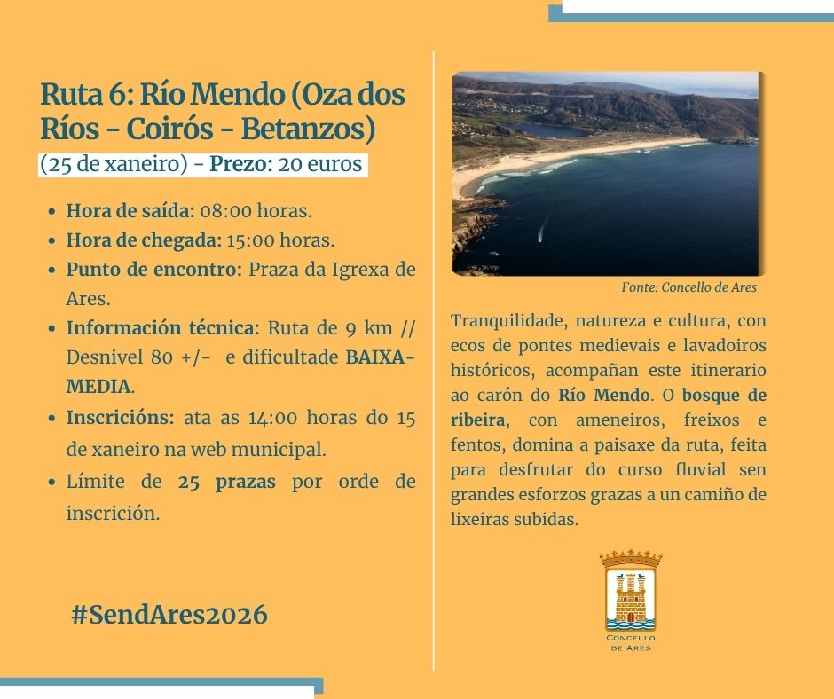 Logo continuará o SendAres con itinerarios na contorna do río Sor, en Mañón (26 de outubro), Oleiros (23 de novembro), Ferrol e o cabo Prior (21 de decembro), Oza dos Ríos-Coirós-Betanzos (25 de xaneiro), Narahío-San Sadurniño (22 de febreiro), Cedeira-Cariño (29 de marzo) e, finalmente, a última ruta en Mondoñedo (26 de abril).