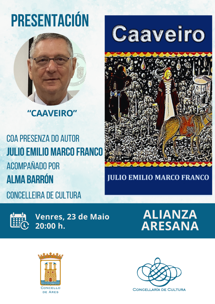 O salón de actos da Alianza Aresana acollerá unha nova presentación literaria coa mirada posta, nesta ocasión, no pasado medieval da Galicia do século XV. Trátase da primeira novela do médico xubilado e doutor en Economía Julio Emilio Marco Franco, “Caaveiro”, un relato a modo de thriller histórico sobre o que falará o próximo venres, 23 de maio, ás 20:00 horas.