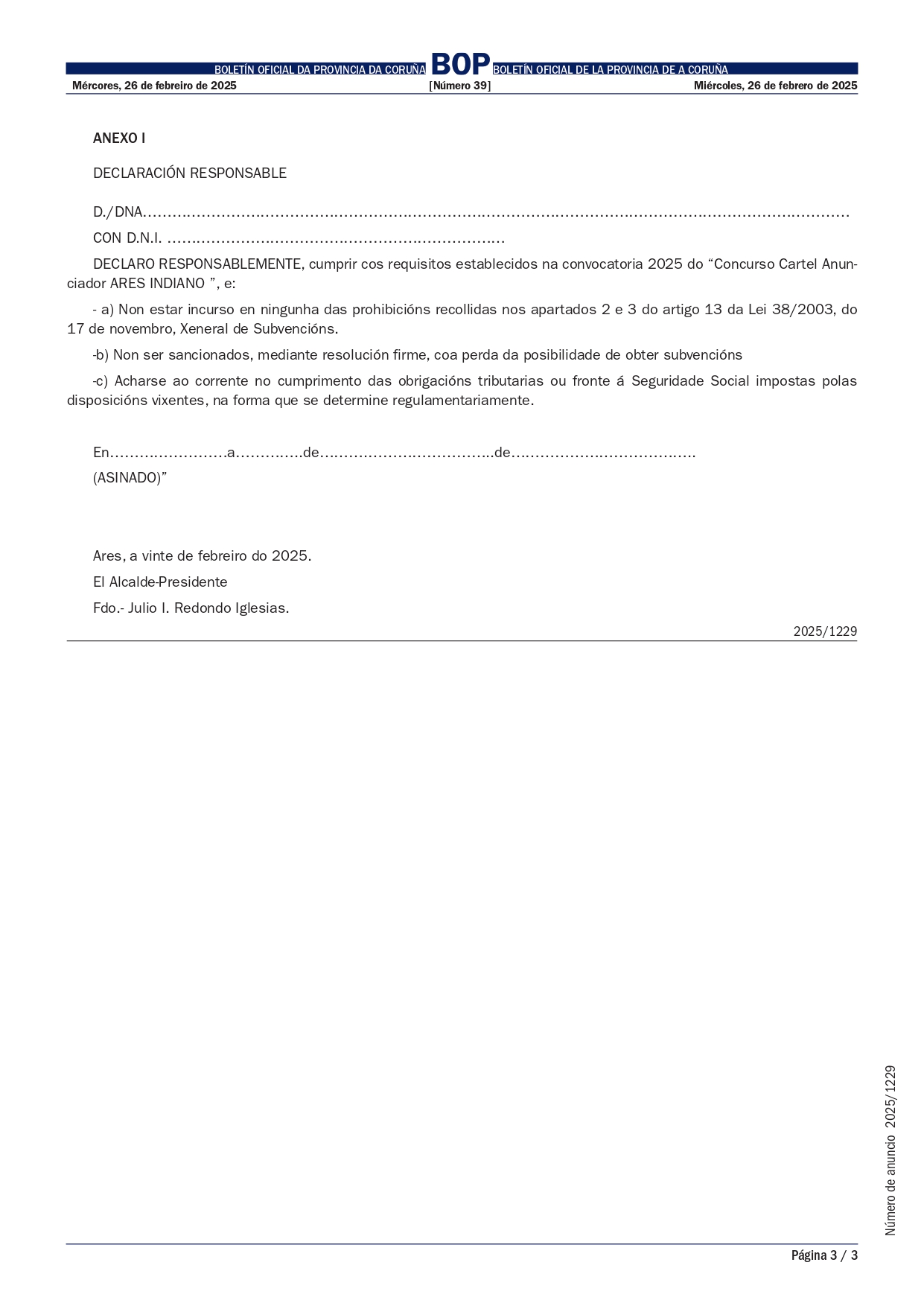 Aprobadas pola Xunta Municipal de Goberno do Concello de Ares en data 20/02/2025 as BASES DO I CONCURSO PARA A SELECCIÓN DO CARTEL ANUNCIADOR DO ARES INDIANO, publícanse integramente as mesmas e se procede á convocatoria do concurso segundo as seguintes: