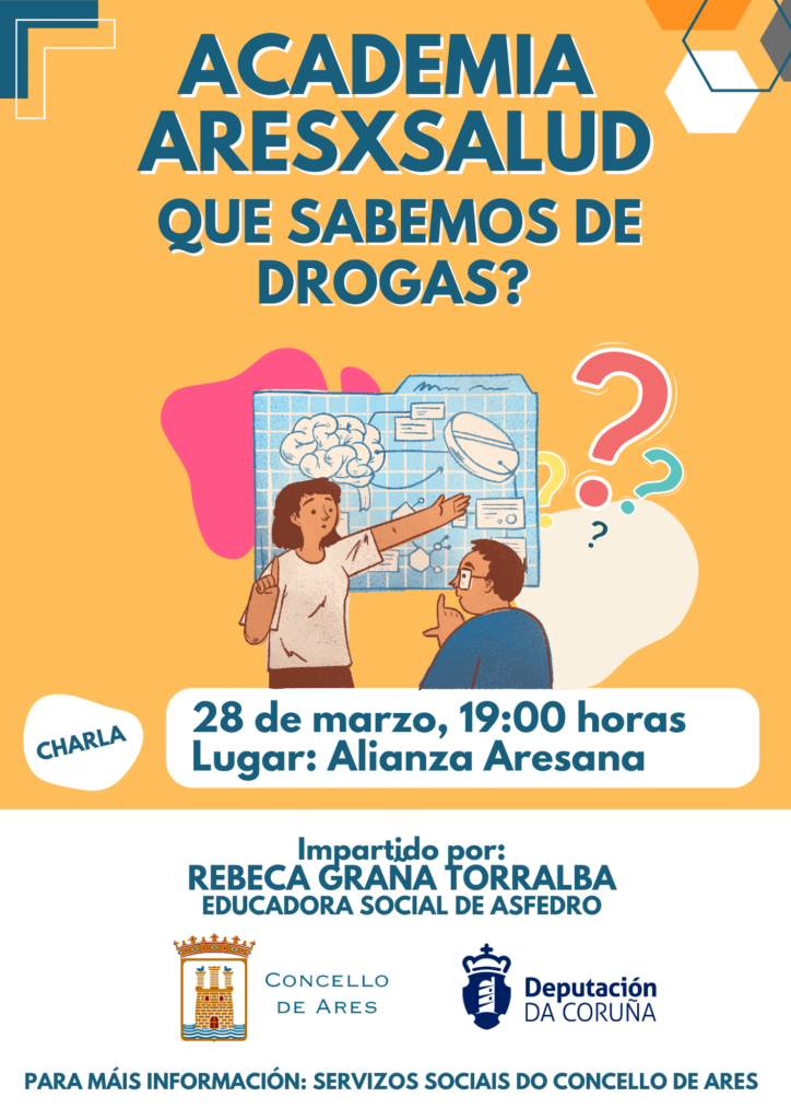 A Alianza Aresana acollerá a quinta charla divulgativa da Academia AresXSalud, o programa educativo do Concello para aprender a incorporar hábitos saudables no día a día. ‘Que sabemos de drogas?’ é o título da próxima ponencia do venres, 28 de marzo, ás 19:00 horas.