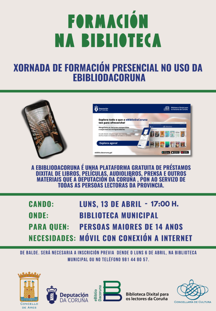 Se queres saber como funciona a plataforma de préstamos dixitais de libros, películas, prensa, audiolibros e outros materiais da Deputación da Coruña, achégate o vindeiro luns, 13 de abril, até a Biblioteca Municipal de Ares ás 17:00 h.